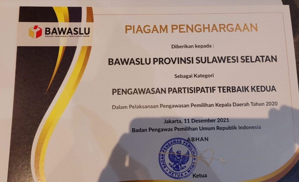 Piagam penghargaan yang diterima oleh Bawaslu Provinsi Sulawesi Selatan sebagai Pengawasan Partisipatif Terbaik Kedua\n\n\n\nJakarta - Badan Pengawas Pemilihan Umum Provinsi Sulawesi Selatan mendapat apresiasi sebagai Bawaslu terbaik kedua untuk kategori Pengawasan Partisipatif dari Bawaslu RI, yang dirangkai dengan kegiatan Rapat Koordinasi Evaluasi Program Kerja T.A. 2021 di Hotel Marcure Ancol Jakarta (11/12-2021).
