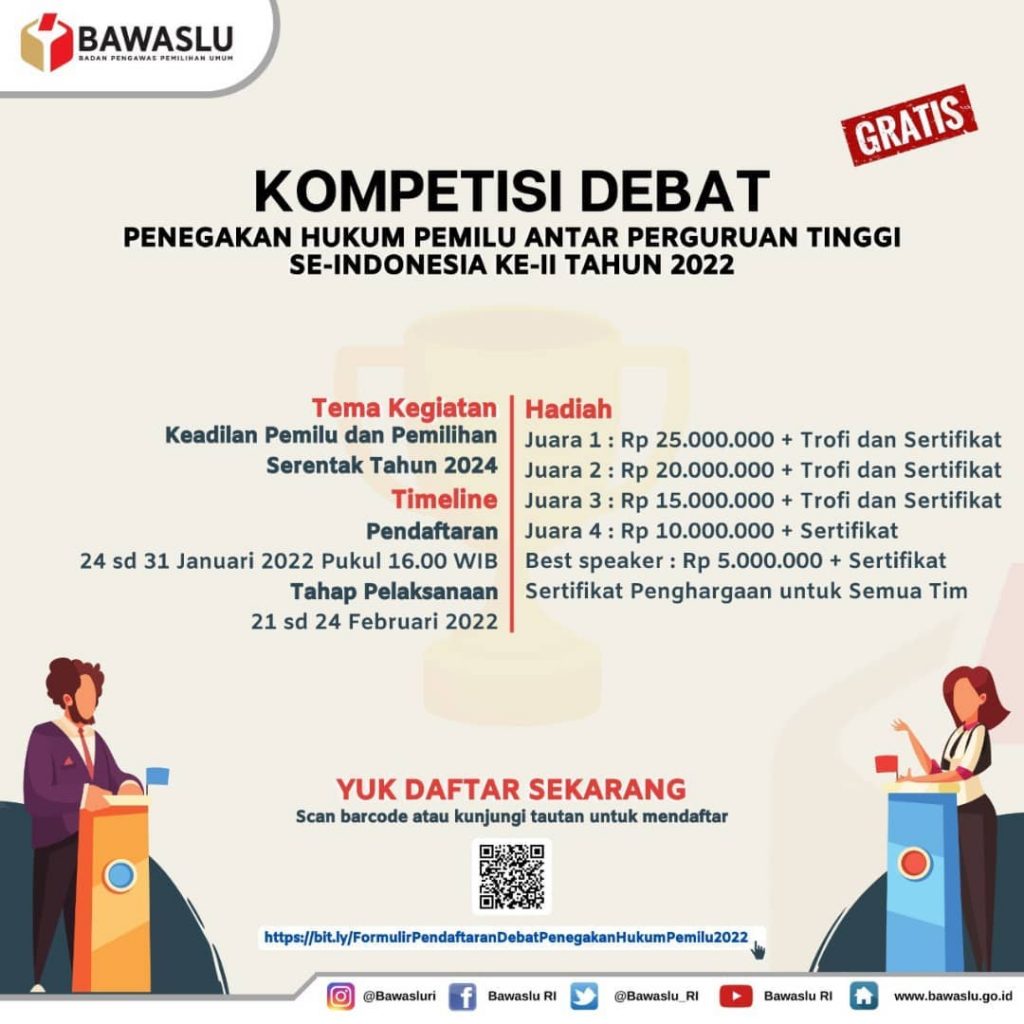 \n\n\n\nSebagai informasi Kompetisi Debat Penegakan Hukum Pemilu Antar Perguruan Tinggi Se-Indonesia merupakan kompetisi kedua yang digelar oleh Bawaslu RI dengan memperebutkan hadiah Puluhan Juta Rupiah dan bebas biaya pendaftaran (Gratis).