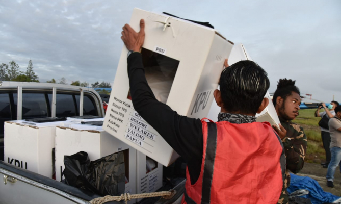 \n\n\n\nPerlu diketahui, pengiriman tujuh kotak surat suara menggunakan helikopter dari Bandara Wamena ini sebagai pengiriman logistik lanjutan terakhir akibat kendala cuaca pengiriman sebelumnya. Ketujuh surat suara ini bakal disebar ketujuh TPS di Distrik Welarek. Serta, saat ini PSU tahap kedua Kabupaten Yalimo memasuki hari tenang sebelum besok masyarakat memberikan hak suaranya.
