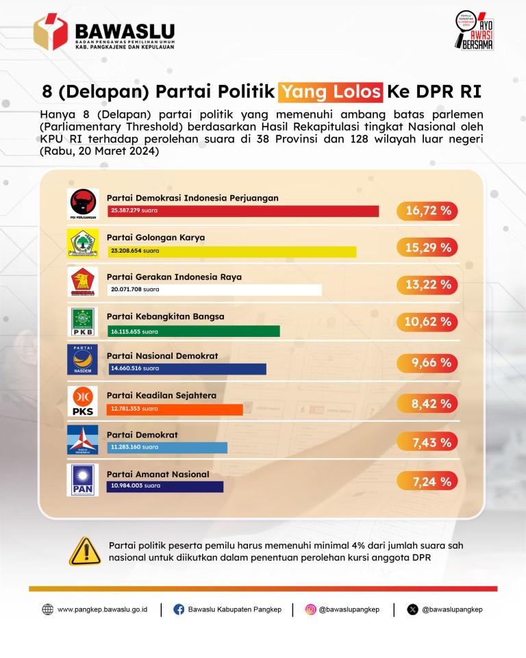 \n\n\n\nBerdasarkan hasil rekapitulasi tingkat nasional oleh Komisi Pemilihan Umum (KPU) Republik Indonesia, terhadap perolehan suara di 38 Provinsi dan 128 wilayah luar negeri (Rabu, 20/03/2024), hanya terdapat 8 (delapan) partai politik yang memenuhi ambang batas parlemen (parliamentary threshold).