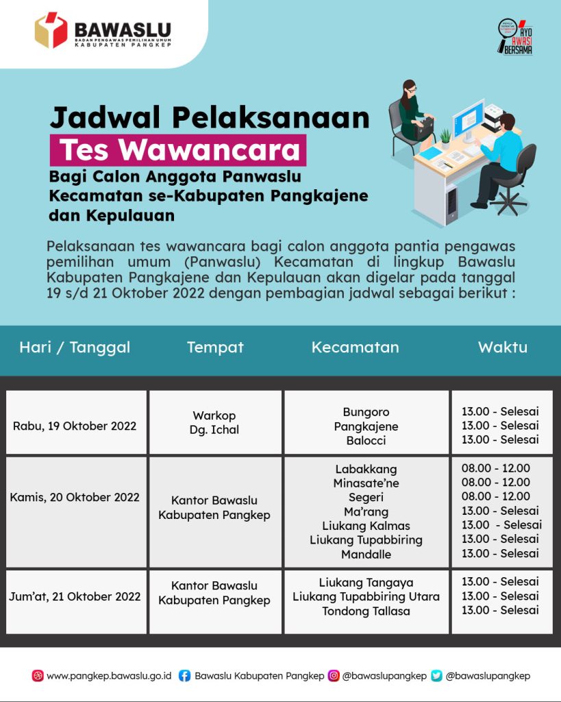Infografis Jadwal Pelaksanaan Tes Wawancara Calon Anggota Panwaslu Kecamatan\n\n\n\nPangkajene, Badan Pengawas Pemilihan Umum - Kelompok kerja pembentukan panitia pengawas pemilihan umum (Panwaslu) Kecamatan Bawaslu Kabupaten Pangkajene dan Kepulauan telah mengumumkan hasil tes tertulis bagi calon anggota Panwaslu Kecamatan yang digelar pada sabtu, 15/10/2022 lalu.