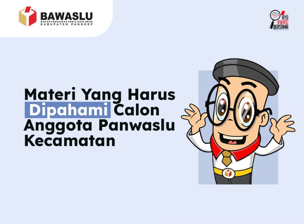 Infografis Materi yang harus dipahami calon anggota Panwaslu Kecamatan\n\n\n\nPangkajene, Badan Pengawas Pemilihan Umum - Dalam pelaksanaan tes tertulis calon anggota Panwaslu Kecamatan, terdapat beberapa materi yang perlu dipahami oleh seluruh calon peserta, materi apa saja yang perlu dipahami? Yuk simak selengkapnya melalui Infografis berikut ini :