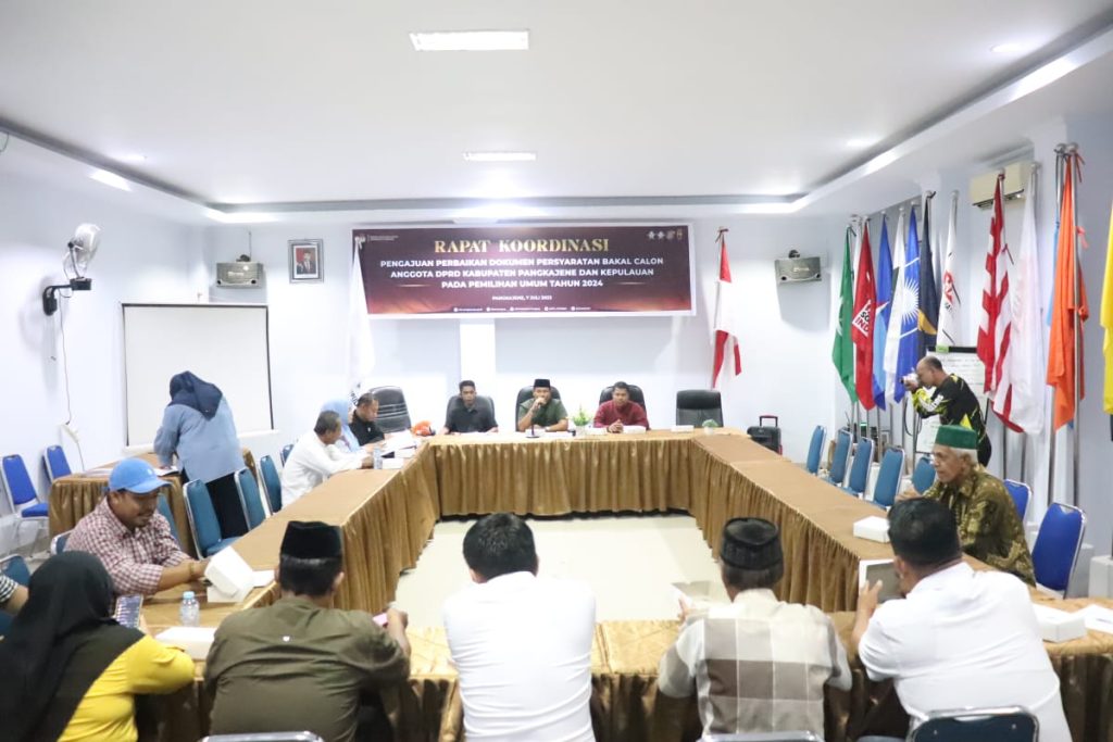 \n\n\n\nRapat koordinasi pengajuan perbaikan dokumen persyaratan bakal calon anggota DPRD Kabupaten Pangkajene dan Kepulauan pada Pemilu Tahun 2024 tersebut digelar di Aula lantai II Kantor KPU Kabupaten Pangkajene dan Kepulauan dihadiri oleh Bawaslu dan pengurus partai politik se-Kabupaten Pangkajene dan Kepulauan.