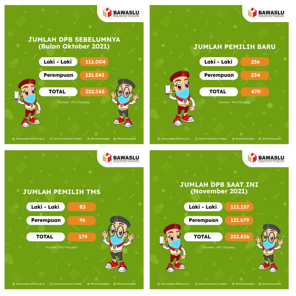 Daftar Pemilih Berkelanjutan Periode November Tahun 2021\n\n\n\nPangkajene - Komisi Pemilihan Umum Kabupaten Pangkajene dan Kepulauan telah menetapkan Daftar Pemilih Berkelanjutan Periode Bulan November Tahun 2021 sebanyak 232.836 Pemilih, data tersebut tertuang pada Berita Acara Komisi Pemilihan Umum Kabupaten Pangkajene dan Kepulauan Nomor: 137/PL.02.1/BA/7310/KPU-Kab/XI/2021 tanggal 30 November 2021.