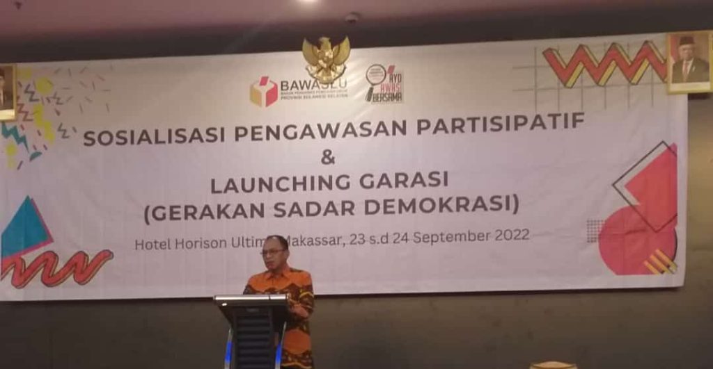 Ketua Bawaslu Provinsi Sulawesi Selatan saat memberikan sambutan pada kegiatan launching garasi\n\n\n\nPangkajene, Badan Pengawas Pemilihan Umum – Badan Pengawas Pemilihan Umum (Bawaslu) Provinsi Sulawesi Selatan resmi meluncurkan Gerakan Sadar Demokrasi (Garasi) bagi Alumni Sekolah Kader Pengawas Partisipatif (SKPP) se-Sulawesi Selatan (Jum’at, 23/09/2022).