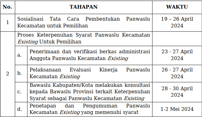 \n\n\n\nBerikut jadwal pembentukan Panitia Pengawas Pemilihan Umum Kecamatan Existing Dalam Pemilihan Tahun 2024 :