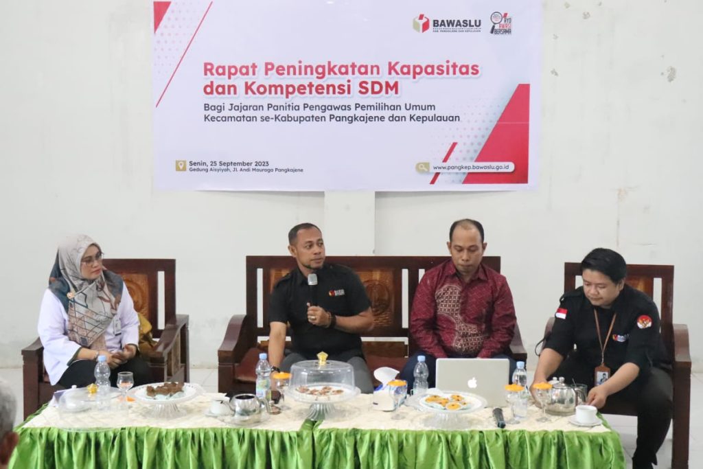 Rapat peningkatan kapasitas dan kompetensi SDM Bawaslu Kabupaten Pangkajene dan Kepulauan\n\n\n\nPangkajene, Badan Pengawas Pemilihan Umum – Pengawas Pemilihan Umum di tingkat Ad-hoc menjadi garda terdepan sekaligus menjadi harapan besar bagi masyarakat dalam mengawal proses demokrasi yang saat ini tengah berlangsung, hal tersebut diungkapkan oleh Ketua Bawaslu Kabupaten Pangkajene dan Kepulauan Samsir Salam saat membuka rapat peningkatan kapasitas dan kompetensi SDM bagi jajaran Panitia Pengawas Pemilihan Umum (Panwaslu) Kecamatan se-Kabupaten Pangkajene dan Kepulauan (Senin, 25/09/2023).