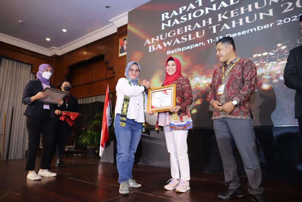 \n\n\n\nPiagam penghargaan diserahkan langsung oleh Anggota Bawaslu RI Lolly Suhenti kepada Koordinator Divisi Hukum, Pencegahan, Partisipasi Masyarakat dan Humas Bawaslu Kabupaten Pangkajene dan Kepulauan Hamsinar Hamid.