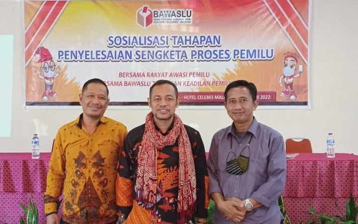 Ketua beserta Anggota dan Kepala Sekretariat Bawaslu Sulawesi Selatan pada kegiatan Sosialisasi Tahapan Penyelesaian Sengketa Proses Pemilu\n\n\n\nMalino – Ketua Bawaslu Kabupaten Pangkajene dan Kepulauan Samsir Salam menghadiri Sosialisasi Tahapan Penyelesaian Sengketa Proses Pemilu yang digelar oleh Bawaslu Provinsi Sulawesi Selatan bertempat di Hotel Celebes Malino (Senin, 14/02/2022).