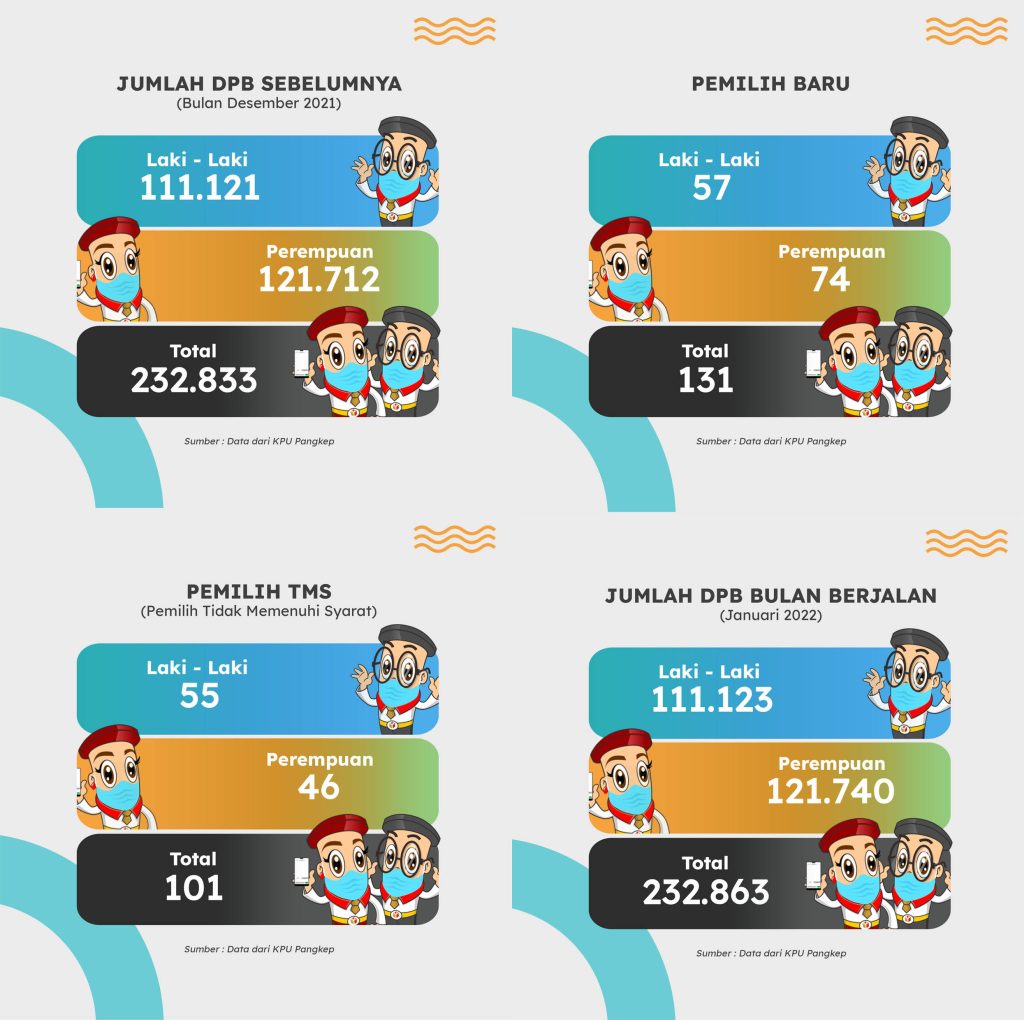 \n\n\n\nHal tersebut sesuai dengan Berita Acara Komisi Pemilihan Umum Kabupaten Pangkajene dan Kepulauan Nomor : 15/PL.02.1/03/7310/2022 tentang Rekapitulasi Daftar pemilih Berkelanjutan (DPB) Tahun 2022 periode Januari 2022 tanggal 31 januari 2022.