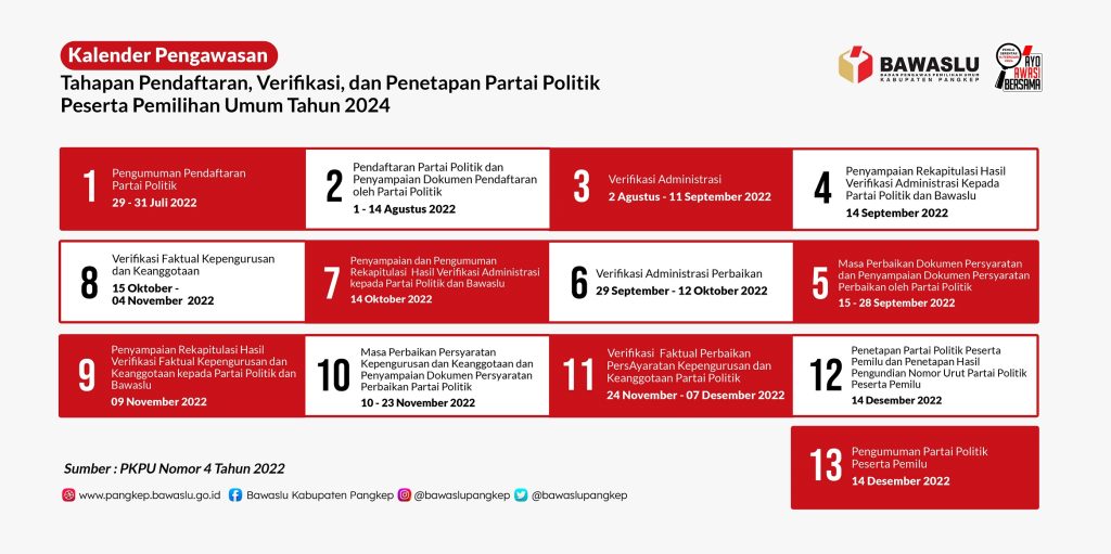 Timeline Tahapan Pendaftaran, Verifikasi dan Penetepan Partai Politik Peserta Pemilu Tahun 2024\n\n\n\nPangkajene – Tahapan pelaksanaan Pemilihan umum telah dimulai sejak 14 juni 2022 lalu, dan saat ini telah memasuki Tahapan Pendaftaran, Verifikasi dan Penetapan partai politik peserta pemilihan umum tahun 2024.