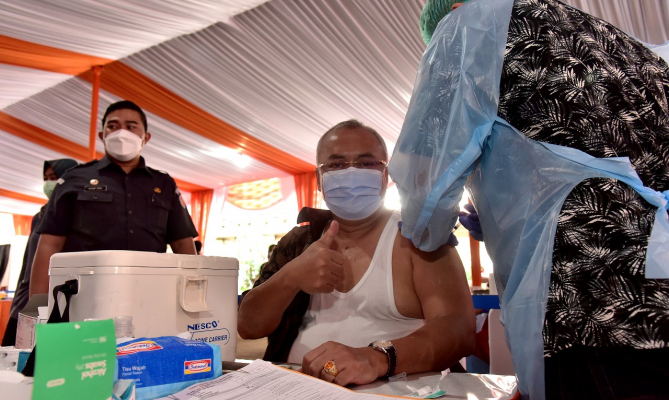 \n\n\n\n"Sebagaimana kita ketahui, gara-gara covid-19, perdekonomian bangsa menjadi terpuruk. Sehingga solusinya adalah vaksinasi bagi selurug warga negara," ujar Gunawan.