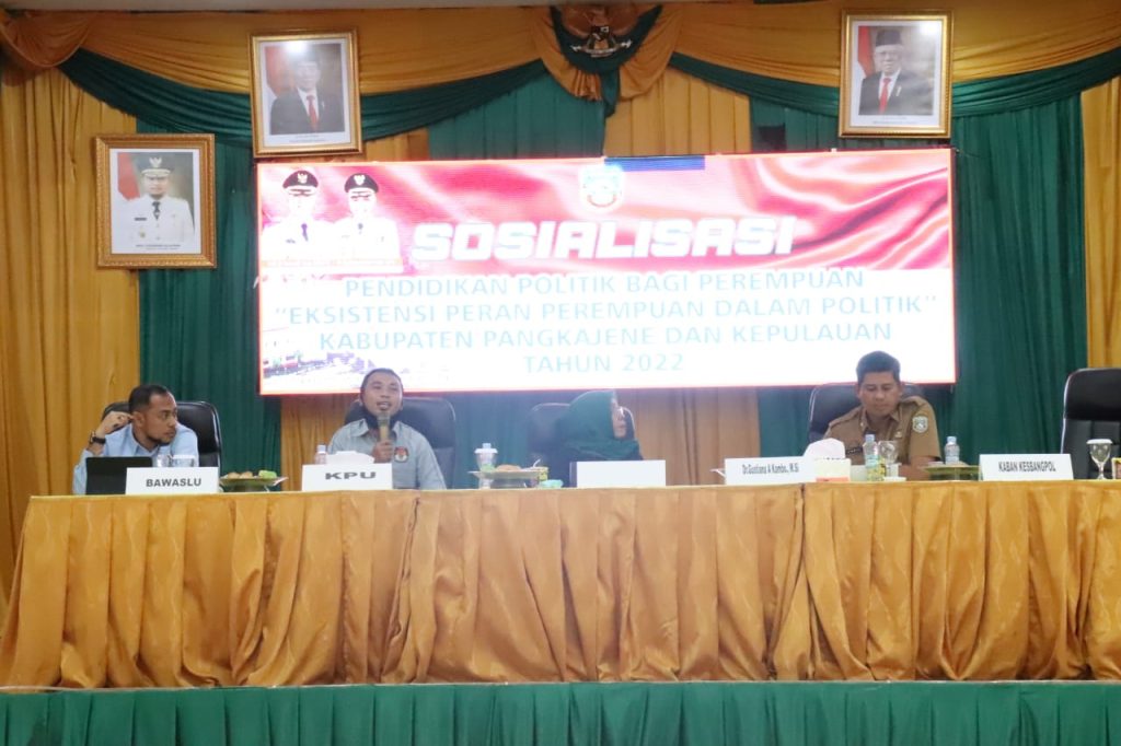Kepala Kesbangpol Pangkep (Amril) saat memandu kegiatan sosialisasi pendidikan politik bagi perempuan\n\n\n\nPangkajene, Badan Pengawas Pemilihan Umum – Badan Kesatuan Bangsa dan Politik Kabupaten Pangkajene dan Kepulauan menggandeng Bawaslu, KPU, dan Dosen Hukum Universitas Hasanuddin pada kegiatan Sosialisasi Pendidikan Politik bagi Perempuan dengan tema “Eksistensi peran perempuan dalam politik” (Selasa, 23/08/2022).